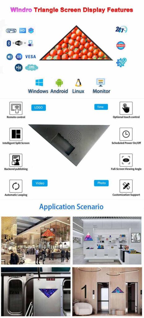 Windro Triangle Screen(also named as Triangle display, LCD display, LCD screen, Triangle monitor, Digital Signage, Android player), which is designed with customization and high compatibility as its core, breaking through the limitations of traditional screen forms and adapting to the needs of multiple industry scenarios. The application not only covers functional requirements such as information display and control interaction, but also broadens the boundary between technology and aesthetics through artistic design.